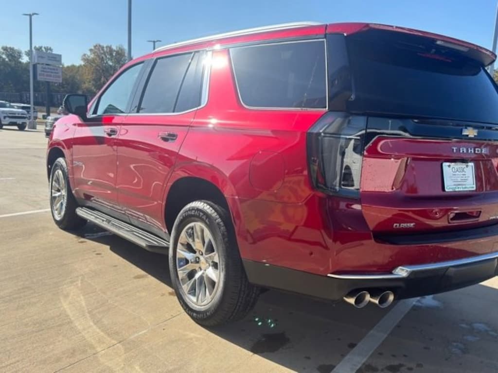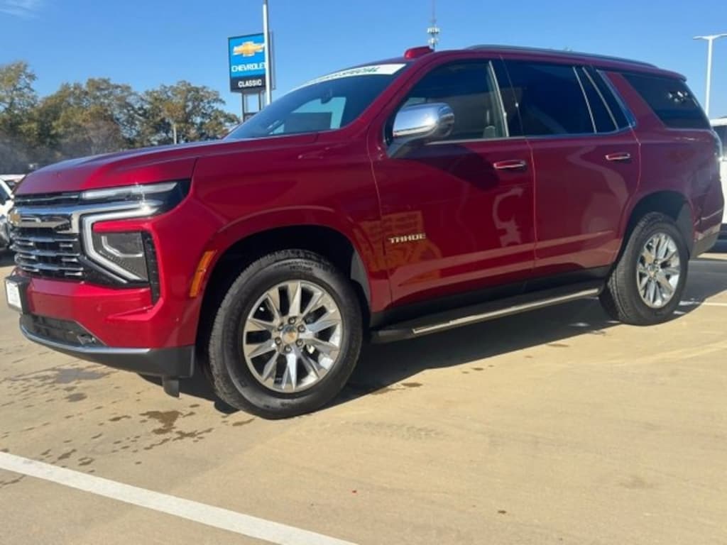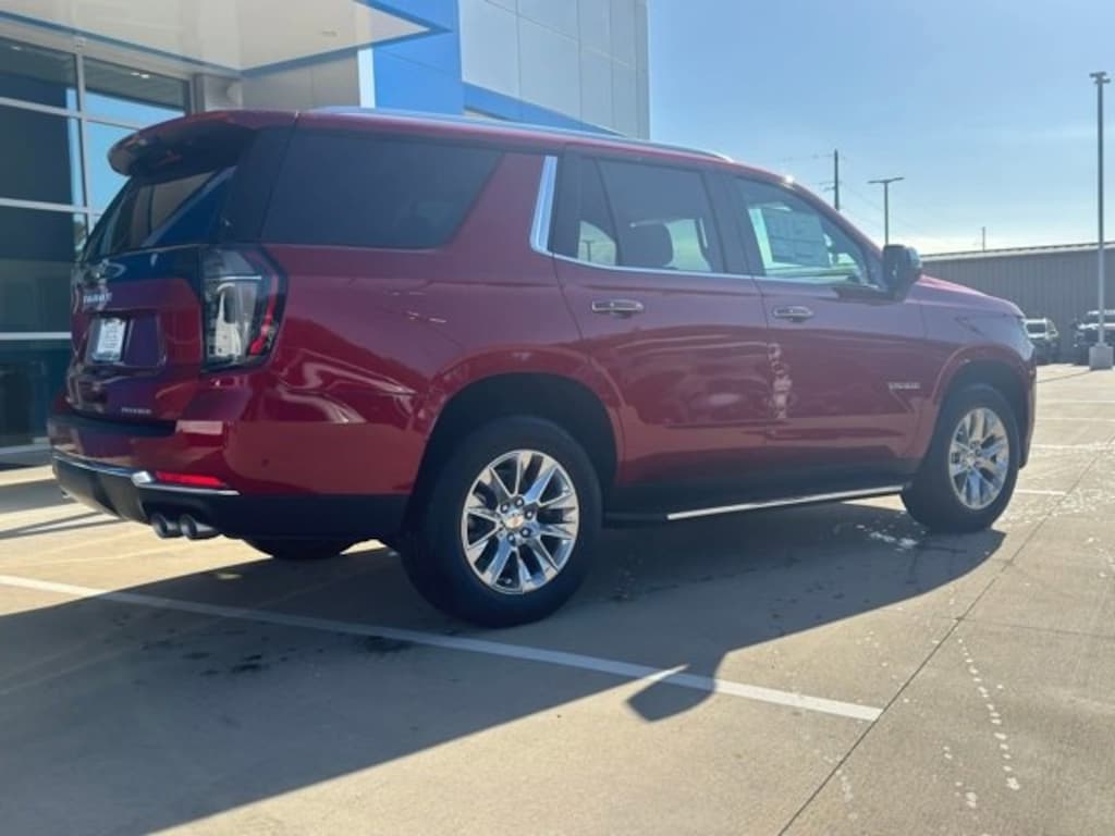 Radiant Red 2025 Chevrolet Tahoe Premier RWD 10-Speed Automatic with Overdrive EcoTec3 5.3L V8 The 2025 Chevrolet Tahoe comes with the following features; License Plate Front Mounting Package, Preferred Equipment Group 1LZ (1st & 2nd Row Color-Keyed Carpeted Floor Mats, 3-Spoke Wrapped Steering Wheel, 3rd Row 60/40 Power-Folding Split-Bench Seat, Auto-Dimming Inside Rear-View Mirror, Bose 10-Speaker Centerpoint Surround Audio Sys Ft, Bright Front & Rear Door Sill Plates, Chrome Door Handles w/Body-Color Strip, Color-Keyed Carpeting Floor Covering, Dual Exhaust System, Floor Console, Front LED Fog Lamps, Front Pedestrian & Bicyclist Braking, Frontal Driver & Outboard Passenger Airbags, Heated 2nd Row Outboard Seats, Heated Steering Wheel, LED Headlamps w/LED Daytime Running Lamps, LED Tail Lamps, Memory Settings, Outside Heated Power-Adjustable Mirrors, Power Release 2nd Row Bucket Seats, Power Tilt & Telescopic Steering Column, Rear Power Liftgate, Remote Start, SiriusXM w/360L Trial Subscription, Universal Home Remote, and Wireless Phone Charging), Black Leather, 10 Speakers, 20 x 9 Polished Aluminum Wheels, 3.23 Rear Axle Ratio, 3rd row seats: split-bench, 4-Way Power Driver Lumbar Seat Adjuster, 4-Way Power Front Passenger Lumbar Seat Adjuster, 4-Wheel Disc Brakes, 8-Way Power Driver Seat Adjuster, 8-Way Power Front Passenger Seat Adjuster, ABS brakes, Adaptive suspension, Air Conditioning, Alloy wheels, AM/FM radio: SiriusXM with 360L, Apple CarPlay/Android Auto, Auto High-beam Headlights, Auto-dimming door mirrors, Auto-dimming Rear-View mirror, Auto-leveling suspension, Automatic temperature control, Brake assist, Bumpers: body-color, Compass, Delay-off headlights, Driver & Front Passenger Heated & Ventilated Seats, Driver door bin, Driver vanity mirror, Dual front impact airbags, Dual front side impact airbags, Electronic Stability Control, Emergency communication system: OnStar and Chevrolet connected services capable, Exterior Parking Camera Rear, Four wheel independent suspension, Front anti-roll bar, Front Bucket Seats, Front Center Armrest, Front dual zone A/C, Front fog lights, Front reading lights, Fully automatic headlights, Garage door transmitter, Heated door mirrors, Heated Driver & Front Passenger Seats, Heated front seats, Heated rear seats, Heated steering wheel, Illuminated entry, Low tire pressure warning, Magnetic Ride Control Suspension, Memory seat, Navigation system: Google built-in compatibility (select service plan required, terms and limitations apply), Occupant sensing airbag, Outside temperature display, Overhead airbag, Overhead console, Panic alarm, Passenger door bin, Passenger vanity mirror, Perforated Leather Seat Trim, Power door mirrors, Power driver seat, Power Liftgate, Power passenger seat, Power steering, Power windows, Premium audio system: Chevrolet Infotainment 3 Premium, Radio data system, Radio: 17.7 Diagonal Advanced Color LCD Display, Rain sensing wipers, Rear air conditioning, Rear anti-roll bar, Rear reading lights, Rear window defroster, Rear window wiper, Remote keyless entry, Security system, Speed control, Speed-sensing steering, Split folding rear seat, Spoiler, Steering wheel memory, Steering wheel mounted audio controls, Tachometer, Telescoping steering wheel, Tilt steering wheel, Traction control, Trip computer, Turn signal indicator mirrors, Variably intermittent wipers, Ventilated front seats, and Voltmeter. Black Leather.