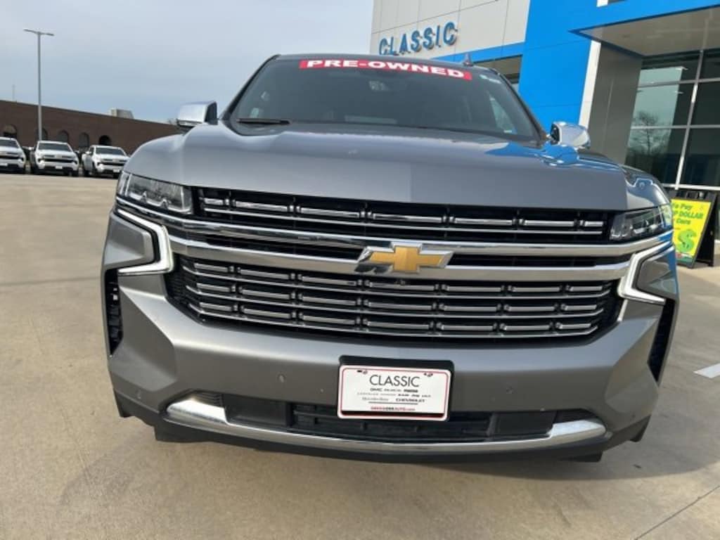 Clean CARFAX. Satin Steel Metallic 2021 Chevrolet Tahoe Premier EcoTec3 5.3L V8 RWD 10-Speed Automatic with Overdrive The 2021 Chevrolet Tahoe comes with the following features; Advanced Trailering Package (Advanced Trailering System, Hitch Guidance w/Hitch View, Integrated Trailer Brake Controller, and Trailer Side Blind Zone Alert), Enhanced Display & Alert Package (15 Diagonal Multi-Color Head-Up Display, HD Surround Vision, Inside Rearview Auto-Dimming Rear Camera Mirror, Rear Camera Mirror Washer, and Rear Pedestrian Alert), License Plate Front Mounting Package, Max Trailering Package (Extra Capacity Cooling System), Preferred Equipment Group 1LZ (1st & 2nd Row Color-Keyed Carpeted Floor Mats, 2 USB Data Ports, 3rd Row 60/40 Power-Folding Split-Bench Seat, Auto-Dimming Inside Rear-View Mirror, Automatic Heated Steering Wheel, Bright Front & Rear Door Sill Plates, Chrome Door Handles w/Body-Color Strip, Chrome Mirror Caps, Color-Keyed Carpeting Floor Covering, Driver & Front Outboard Passenger Airbags, Dual Exhaust System, Enhanced Driver Information Center, Floor Console w/Storage Area, Front & Rear Park Assist, Hands-Free Rear Power Programmable Liftgate, HD Radio, Heated 2nd Row Outboard Seats, Infotainment Display, Lane Change Alert w/Side Blind Zone Alert, Lane Keep Assist w/Lane Departure Warning, Leather-Wrapped Steering Wheel, LED Daytime Running Lamps, Memory Settings, Outside Heated Power-Adjustable Mirrors, Power Release 2nd Row Bucket Seats, Power Tilt & Telescopic Steering Column, Rear Cross Traffic Alert, Remote Start, Safety Alert Seat, SiriusXM NavTraffic, SiriusXM Radio w/360L, and Universal Home Remote), Premium Package (Adaptive Cruise Control, Dual-Pane Power Panoramic Sunroof, and Enhanced Automatic Emergency Braking), Jet Black Leather, 10 Speakers, 12-Way Power Driver & Passenger Seat Adjusters, 20 x 9 Polished Aluminum Wheels, 3.23 Rear Axle Ratio, 3rd row seats: split-bench, 4-Wheel Disc Brakes, ABS brakes, Adaptive suspension, Air Conditioning, Alloy wheels, AM/FM radio: SiriusXM with 360L, Apple CarPlay/Android Auto, Auto High-beam Headlights, Auto-dimming door mirrors, Auto-dimming Rear-View mirror, Auto-leveling suspension, Automatic temperature control, Bose 10-Speaker Centerpoint Surround Audio Sys Ft, Brake assist, Bumpers: body-color, Compass, Delay-off headlights, Driver door bin, Driver vanity mirror, Dual front impact airbags, Dual front side impact airbags, Electronic Stability Control, Emergency communication system: OnStar and Chevrolet connected services capable, Four wheel independent suspension, Front anti-roll bar, Front Bucket Seats, Front Center Armrest, Front dual zone A/C, Front High-Back Reclining Bucket Seats, Front reading lights, Fully automatic headlights, Garage door transmitter, Heated & Ventilated Driver & Front Passenger Seats, Heated door mirrors, Heated Driver & Front Passenger Seats, Heated front seats, Heated rear seats, Heated steering wheel, Illuminated entry, Leather steering wheel, Low tire pressure warning, Magnetic Ride Control Suspension, Memory seat, Navigation System, Occupant sensing airbag, Outside temperature display, Overhead airbag, Overhead console, Panic alarm, Passenger door bin, Passenger vanity mirror, Perforated Leather Seat Trim, Power door mirrors, Power driver seat, Power Liftgate, Power passenger seat, Power steering, Power windows, Premium audio system: Chevrolet Infotainment 3, Radio: Chevrolet Infotainment 3 Premium System, Rain sensing wipers, Rear air conditioning, Rear anti-roll bar, Rear reading lights, Rear window defroster, Rear window wiper, Remote keyless entry, Roof rack: rails only, Security system, Speed control, Speed-sensing steering, Split folding rear seat, Spoiler, Steering wheel memory, Steering wheel mounted audio controls, Tachometer, Telescoping steering wheel, Tilt steering wheel, Traction control, Trip computer, Turn signal indicator mirrors, Variably intermittent wi