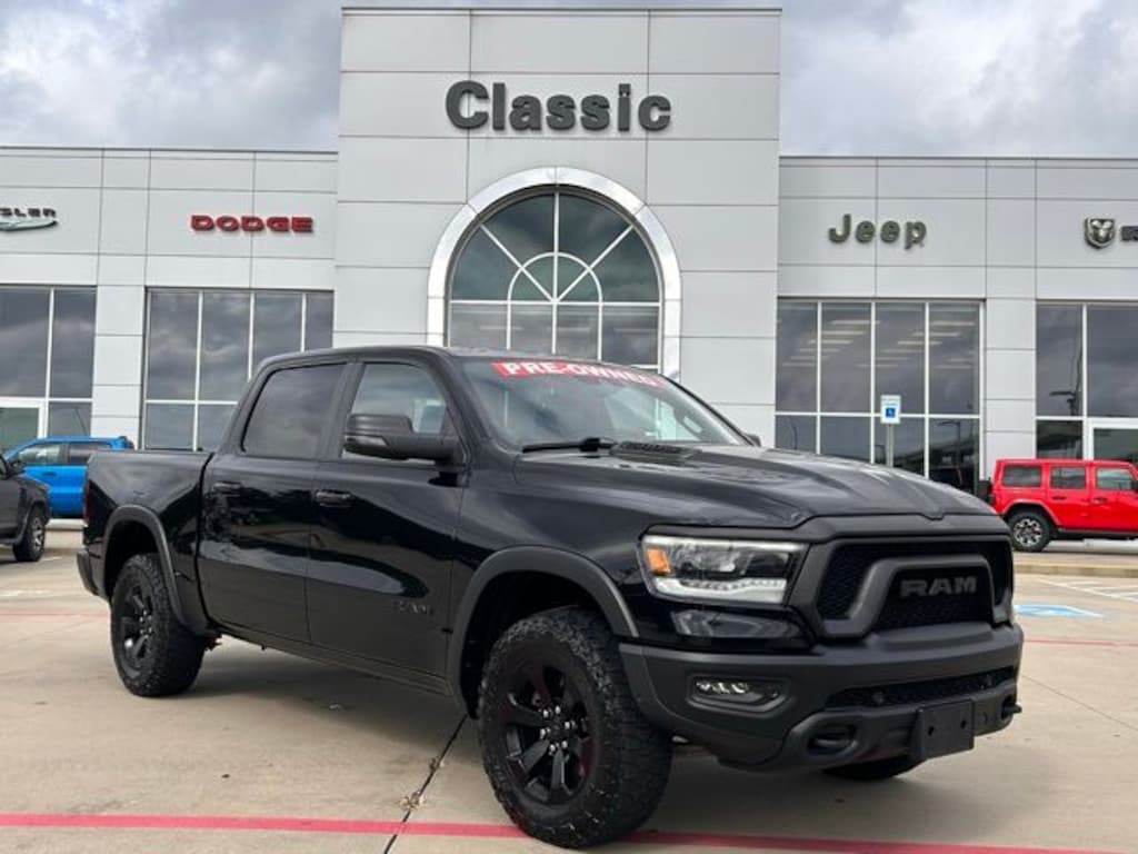 CARFAX One-Owner. Clean CARFAX. Classic CDJR in Texarkana is proud to offer this attractive 2023 Ram 1500 in Diamond Black Crystal Pearlcoat. This 2023 Ram 1500 comes with the following features; Bed Utility Group (MOPAR 4 Adjustable Cargo Tie-Down Hooks and Pick-Up Box Lighting), Night Edition (Black Front Bumper w/Black Plate, Grille Surround 2 Black Texture 3 Black, RAM Grille Badge - Black, and Wheels: 18" x 8.0" Gloss Black), Quick Order Package 27W Rebel, Rebel Level 2 Equipment Group (115V Auxiliary Rear Power Outlet, 12" Touchscreen Display, 2-Door Passive Entry, Front Door Locks, 2nd Row In Floor Storage Bins, 4G LTE Wi-Fi Hot Spot, Accent Color Door Handles, Apple CarPlay, Auto-Dimming Exterior Driver Mirror, Black Exterior Mirrors, Black Premium Power Mirrors, Connected Travel & Traffic Services, Connectivity - US/Canada, Convex Wide-Angle Exterior Mirror Insert, Disassociated Touchscreen Display, Exterior Mirrors Courtesy Lamps, Exterior Mirrors w/Heating Element, Exterior Mirrors w/Supplemental Signals, Foam Bottle Insert (Door Trim Panel), For Details, Visit DriveUconnect.com, For More Info, Call 800-643-2112, Global Telematics Box Module (TBM), Google Android Auto, GPS Antenna Input, GPS Navigation, harman/kardon 19 Speaker Premium Sound, HD Radio, Heated Front Seats, Heated Steering Wheel, Integrated Center Stack Radio, Integrated Voice Command w/Bluetooth, Media Hub w/2 Charge Only USBs, Off-Road Information Pages, ParkSense Front/Rear Park Assist w/Stop, Power 2-Way Driver Lumbar Adjust, Power 8-Way Driver Seat, Power Adjustable Pedals, Power-Folding Mirrors, Radio: Uconnect 5 Nav w/12.0" Display, Rain Sensitive Windshield Wipers, Rear Dome w/On/Off Switch Lamp, Rear Power Sliding Window, Rear Underseat Compartment Storage, Rear Window Defroster, Remote Start System, Security Alarm, SiriusXM Radio Service, SiriusXM w/360L, Sun Visors w/Illuminated Vanity Mirrors, Universal Garage Door Opener, and USB Host Flip), Technology Group (Digital Rearview Mirror, Heads-Up Display, and LED CHMSL Lamp), 3.92 Rear Axle Ratio, 33 Gallon Fuel Tank, 4 Way Front Headrests, 4-Corner Air Suspension, 4-Wheel Disc Brakes, 48V Belt Starter Generator, 6 Speakers, ABS brakes, Active Noise Control System, Air Conditioning, Alloy wheels, AM/FM radio: SiriusXM with 360L, Apple CarPlay/Android Auto, Auto-dimming Rear-View mirror, Automatic temperature control, Blind Spot & Cross Path Detection, Brake assist, Bucket Seats, Class IV Receiver Hitch, Cloth/Vinyl Low Back Bucket Seats, Compass, Delay-off headlights, Driver door bin, Dual Exhaust w/Black Tips, Dual front impact airbags, Dual front side impact airbags, Electric Shift-On-Demand Transfer Case, Electronic Stability Control, Emergency communication system: SiriusXM Guardian, Front anti-roll bar, Front Bucket Seats, Front Center Armrest w/Storage, Front dual zone A/C, Front fog lights, Front License Plate Bracket, Front reading lights, Front Seat Back Map Pockets, Front wheel independent suspension, Full Length Upgraded Floor Console, Fully automatic headlights, Heated door mirrors, Heavy-Duty Engine Cooling, HEMI Badge, Illuminated entry, Instrument Cluster Theme 2 - Rebel, Leather steering wheel, Low tire pressure warning, Lux Leather Trimmed Bucket Seats, MOPAR Deployable Bed Step, MOPAR Spray In Bedliner, Navigation System, Occupant sensing airbag, Outside temperature display, Overhead airbag, Overhead console, Panic alarm, ParkView Rear Back-Up Camera, Passenger door bin, Passenger vanity mirror, Passive Tuned Mass Damper, Power 2-Way Passenger Lumbar Adjust, Power 8-Way Driver & Passenger Seats, Power door mirrors, Power steering, Power windows, Radio data system, Radio: Uconnect 5 Nav w/8.4" Display, Rear 60/40 Folding Seat, Rear anti-roll bar, Rear seat center armrest, Rear step bumper, Rear Wheelhouse Liners, Remote keyless entry, Speed control, Split folding rear seat, Steering wheel mounted audio controls, Tachometer, Telescoping steering wheel, Tilt steering wheel, Tra