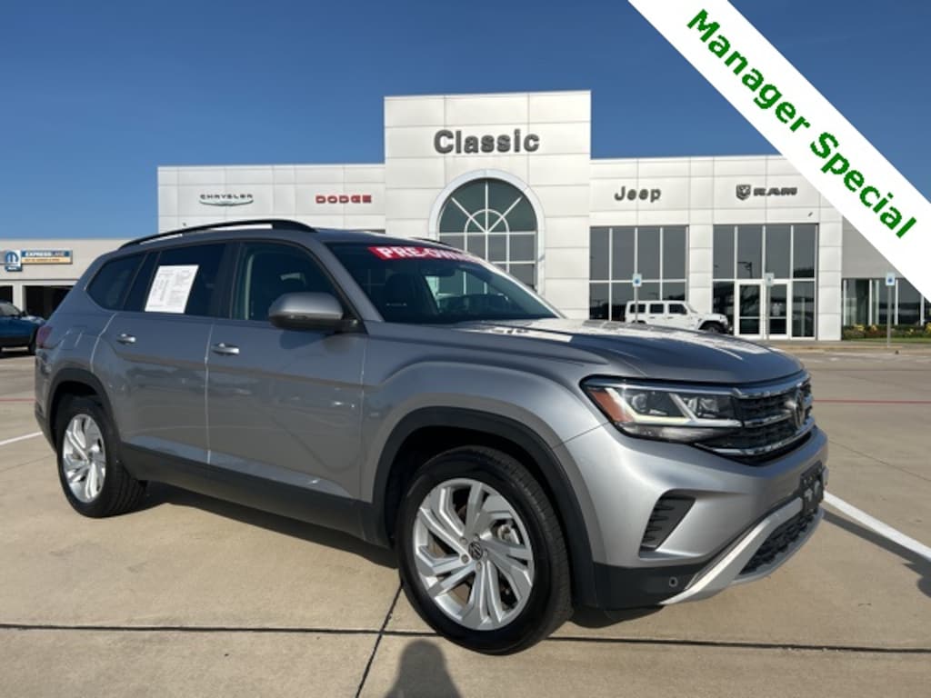 CARFAX One-Owner. Clean CARFAX. Classic CDJR in Texarkana is proud to offer this handsome-looking 2022 Volkswagen Atlas in Silver. This 2022 Volkswagen Atlas comes with the following features; 3.60 Axle Ratio, 3rd row seats: split-bench, 4-Wheel Disc Brakes, 6 Speakers, ABS brakes, Air Conditioning, Alloy wheels, AM/FM radio: SiriusXM with 360L, Auto-dimming Rear-View mirror, Automatic temperature control, Brake assist, Bumpers: body-color, Compass, Delay-off headlights, Driver door bin, Driver vanity mirror, Dual front impact airbags, Dual front side impact airbags, Electronic Stability Control, Emergency communication system, Exterior Parking Camera Rear, Four wheel independent suspension, Front anti-roll bar, Front Bucket Seats, Front Center Armrest, Front dual zone A/C, Front fog lights, Front reading lights, Fully automatic headlights, Heated Comfort Front Bucket Seats, Heated door mirrors, Heated front seats, Illuminated entry, Leather Shift Knob, Low tire pressure warning, Occupant sensing airbag, Outside temperature display, Overhead airbag, Overhead console, Panic alarm, Passenger door bin, Passenger vanity mirror, Perforated V-Tex Leatherette Seating Surfaces, Power door mirrors, Power driver seat, Power Liftgate, Power steering, Power windows, Radio data system, Radio: MIB3 Composition Media w/8" Touchscreen, Rain sensing wipers, Rear air conditioning, Rear anti-roll bar, Rear reading lights, Rear seat center armrest, Rear window defroster, Rear window wiper, Remote keyless entry, Roof rack: rails only, Security system, Speed control, Speed-sensing steering, Split folding rear seat, Spoiler, Standard Suspension, Steering wheel mounted audio controls, Tachometer, Telescoping steering wheel, Tilt steering wheel, Traction control, Trip computer, Turn signal indicator mirrors, Variably intermittent wipers, and Wheels: 20" x 8J 5-Spoke Silver Painted Alloy.